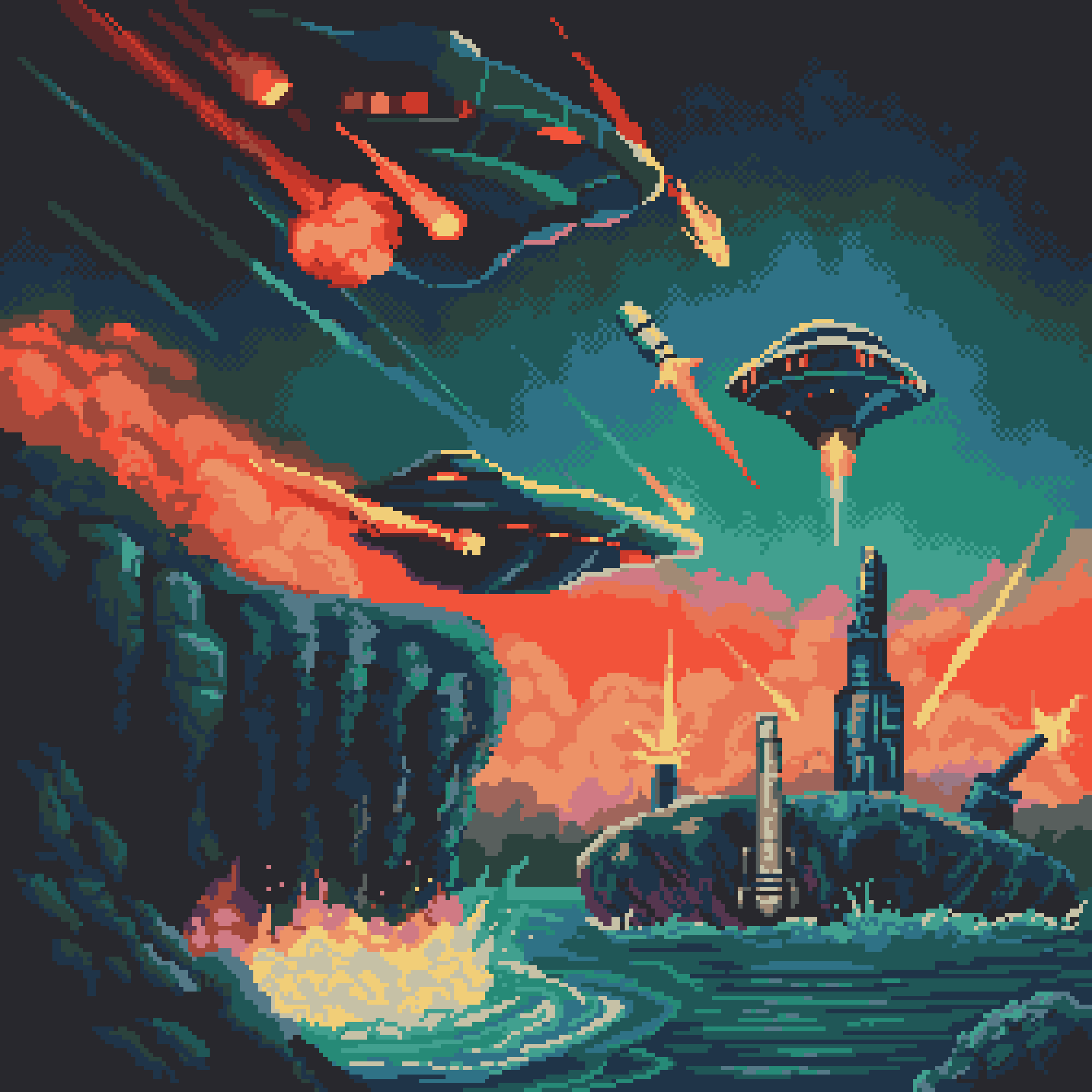 The Last Sentinel, my own remake of the classic Intellivison/Atari game Atlantis, with some spins involving a hybrid flying saucer/middle turret (it transforms) and a night market to buy better equipment. For Mac and PC.